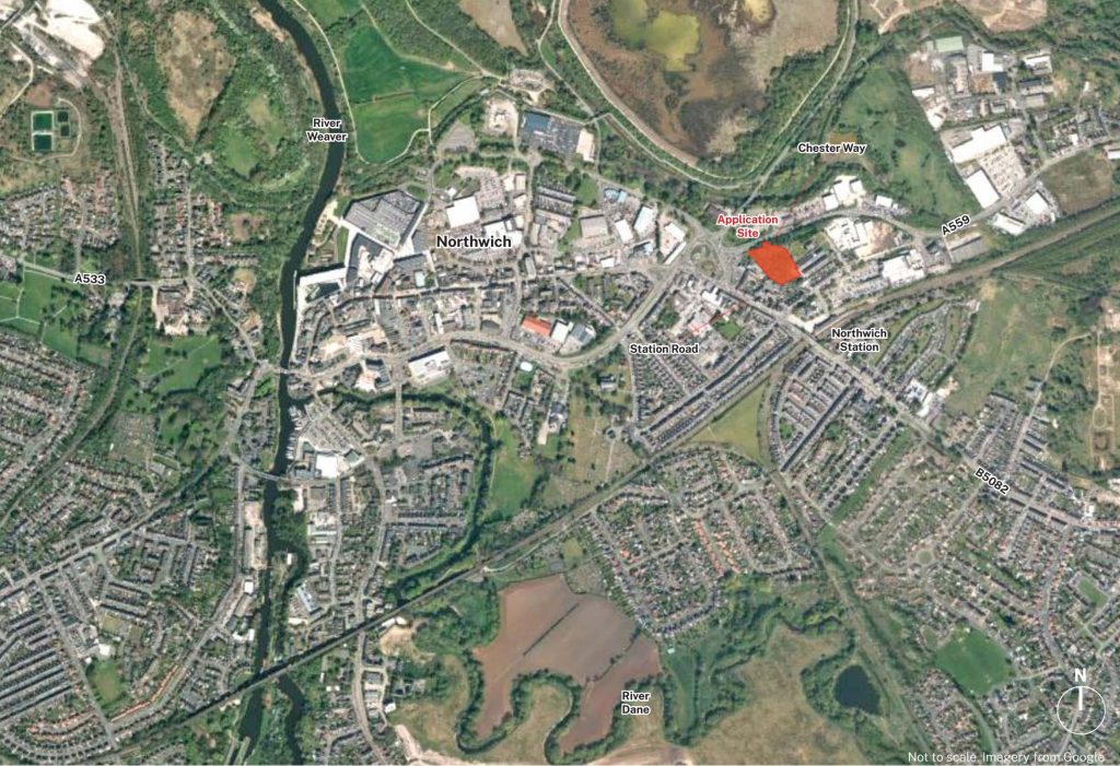 The site is located to the north east of Northwich in an area with mixed uses including residential, retail and commercial (see plan above, site highlighted in red). The centre of Northwich is just over 1km to the west. A significant park area lies to the north of the site based around the reclaimed lime bed flashes from the salt works, creating pools which encourage significant wildlife ecology. The Lion Salt Works Museum sits to the north east of this area.